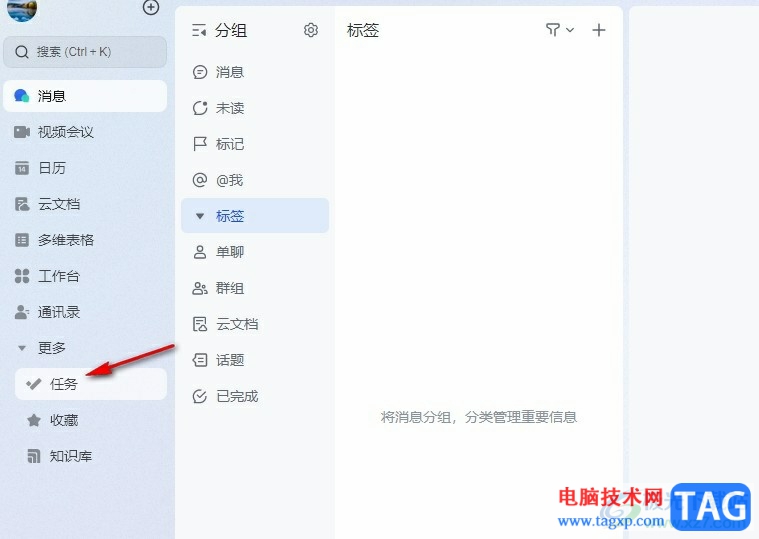 1、第一步,我们在电脑中的飞书页面中点击打开左侧列表中的“更多”选项