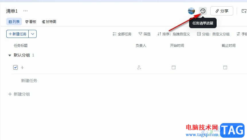 5、第五步,接着我们在页面右上点击打开时钟图标也就是任务清单进展选项