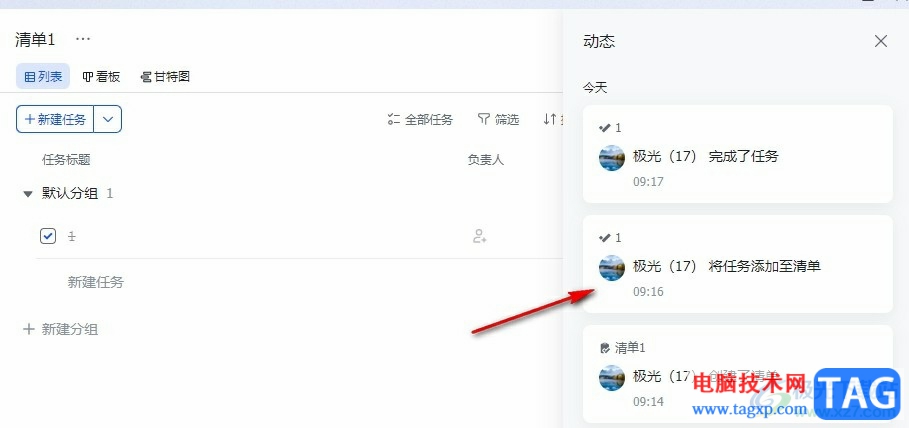 6、第六步,最后在动态窗格中,我们就能看到该任务清单中每个成员对任务的操作了