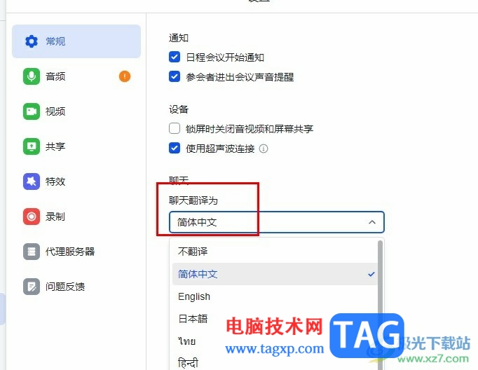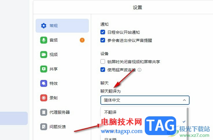 5、第五步,最后在设置的常规页面中,我们点击打开聊天翻译为选项,然后在下拉列表中点击选择“简体中文”选项即可