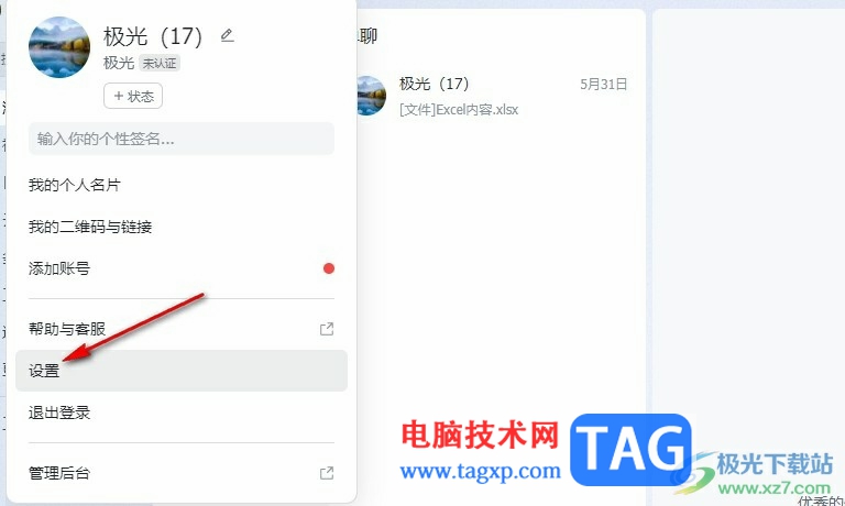 2、第二步,打开头像之后,我们在弹框中找到设置选项,点击打开该选项