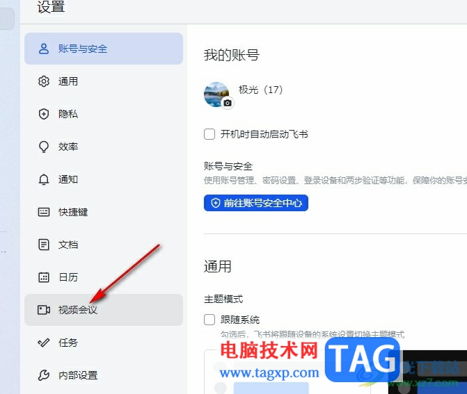 3、第三步,进入飞书的设置页面之后,我们先在左侧列表中点击打开“视频会议”选项