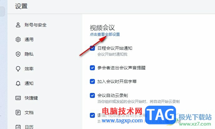 4、第四步,接着在视频会议设置页中打开“点击查看全部设置”选项