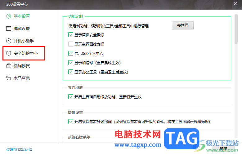 3.这时,我们就会进入到360安全卫士中,在左侧的位置将【安全防护中心】选项进行点击一下。