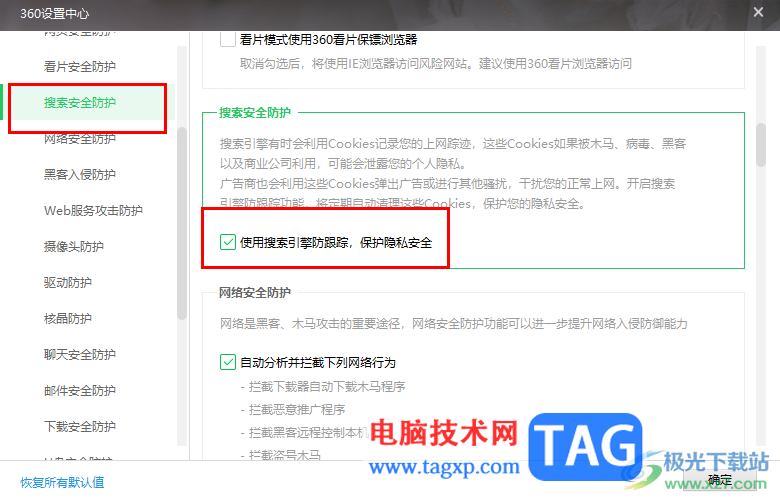 4.这时,即可弹出一些相关的子选项,滚动子选项找到【搜索安全防护】选项功能,在右侧的位置即可看到【使用搜索引擎防跟踪,保护隐私安全】选项。