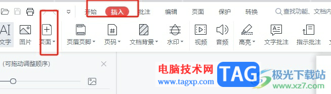 2.接着在页面上方的菜单栏中点击插入选项,将会显示出相关的选项卡,用户选择其中的页面选项