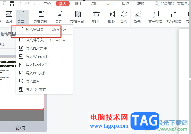 3.在弹出来的下拉选项卡中,用户选择位于首位的插入空白页选项,将会打开新窗口
