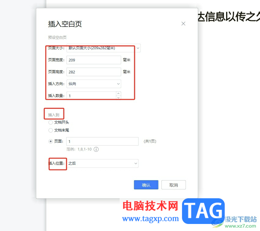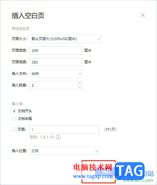 4.进入到插入空白页窗口中,用户按照需求来设置好页面的大小、插入方向、插入数量和插入位置等