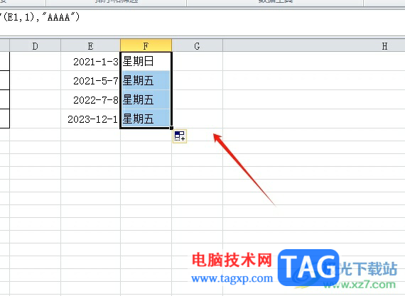 3.这时用户在单元格中就可以看到显示出来的星期几,然后用户简单的利用下拉填充功能来计算出剩下的周数信息