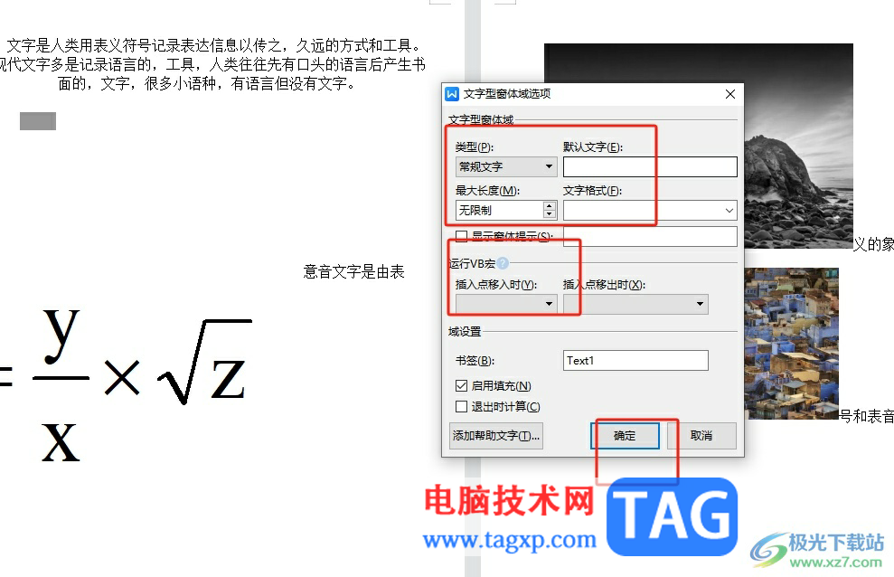 5.接着用户双击窗体,在打开的文字型窗体域选项窗口中,用户在文字型窗体域板块、运行vb宏和域设置板块中来进行设置,然后按下确定按钮