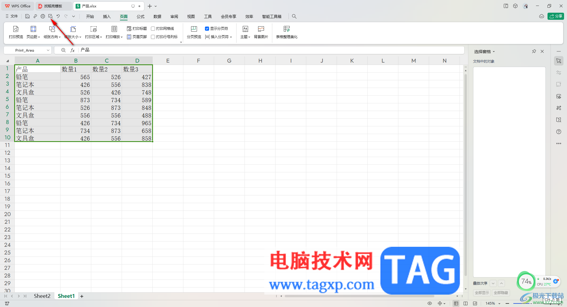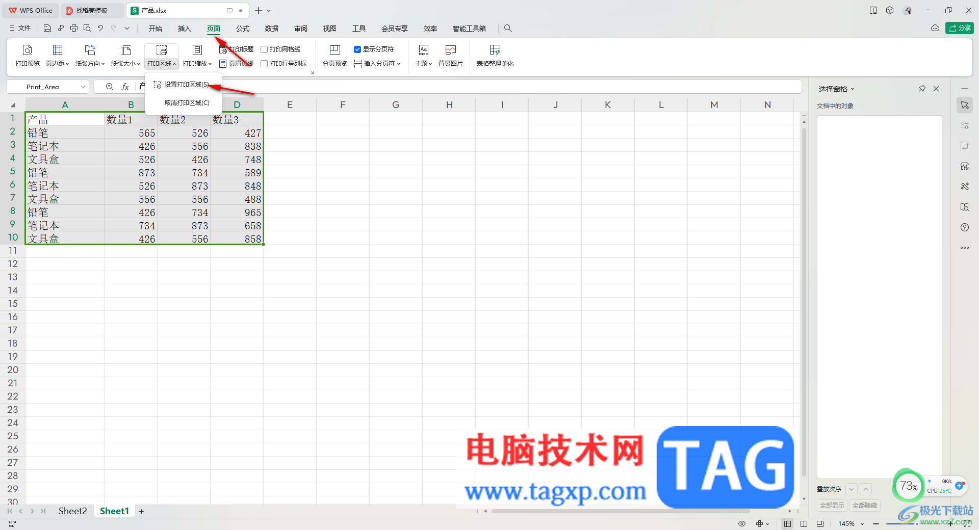 2.随后,我们就可以在【页面】选项工具栏中进行【设置打印区域】,如图所示。
