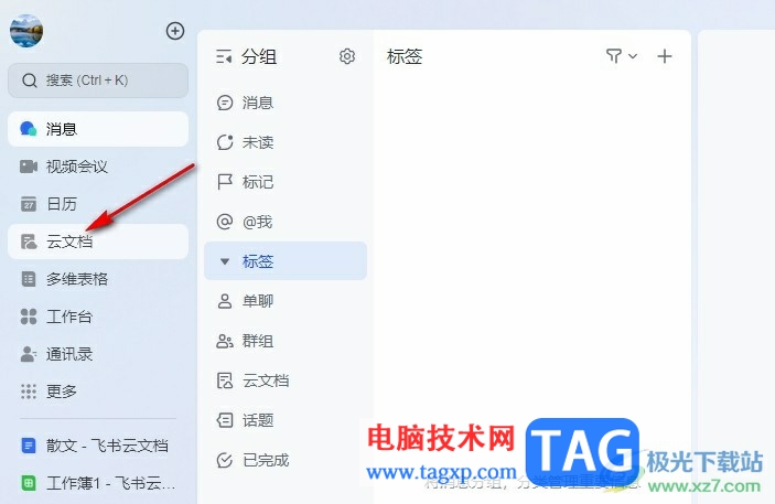 1、第一步,我们在电脑中点击打开飞书软件,再在飞书软件中打开云文档选项