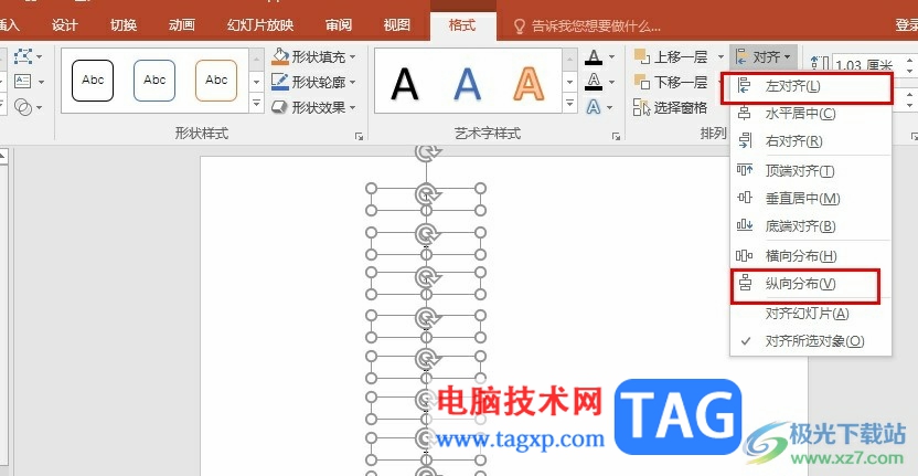 以上就是小编整理总结出的关于PPT将文字快速对齐的方法,我们在PPT中选中所有文本框,然后在格式的子工具栏中打开对齐工具,接着在下拉列表中先点击“左对齐”选项,再点击“纵向分布”选项,就能将左右文字快速对齐了,感兴趣的小伙伴快去试试吧。