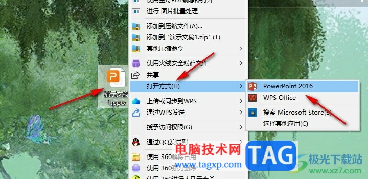 1、第一步,我们在电脑中右键单击一个需要编辑的演示文稿,然后先点击打开方式选项,再点击powerpoint选项