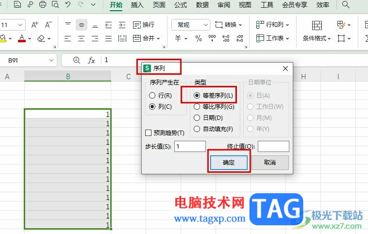 4、第四步,打开序列工具之后,我们在弹框中完成等差序列的设置,然后点击确定选项即可