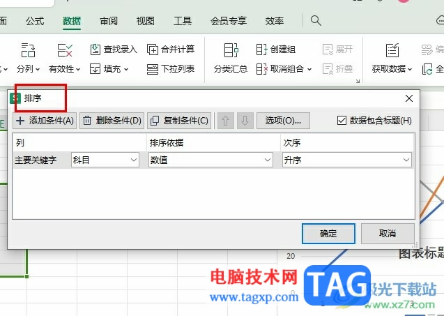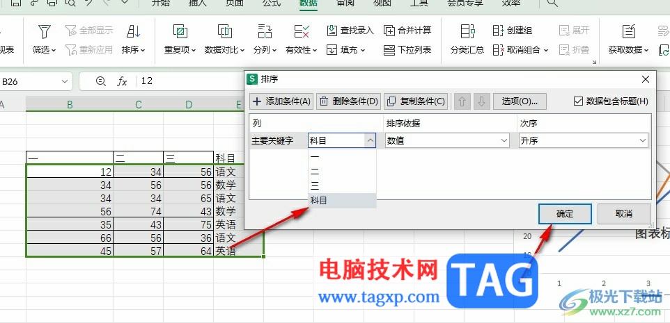 4、第四步,接着我们在排序的弹框中设置好关键字以及次序,最后点击确定选项即可