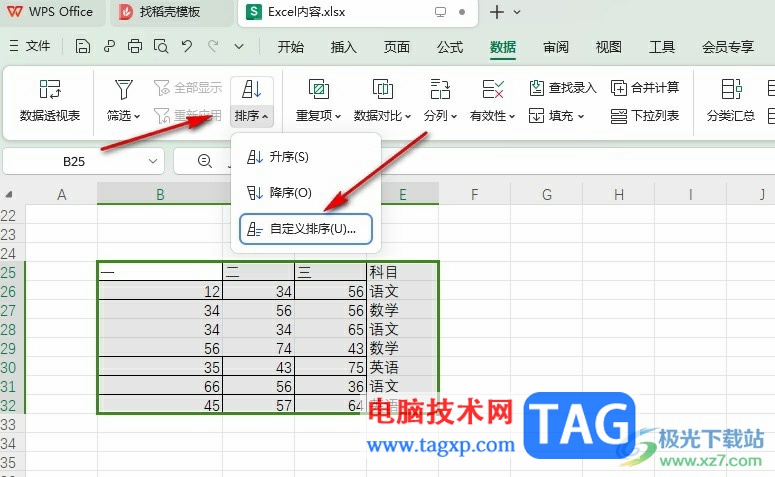 3、第三步,在“数据”的子工具栏中我们打开排序工具,然后在下拉列表中点击选择“自定义排序”选项