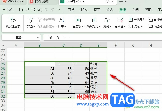 2、第二步,进入WPS编辑页面之后,我们在表格中选中数据所在单元格,然后在工具栏中打开数据工具