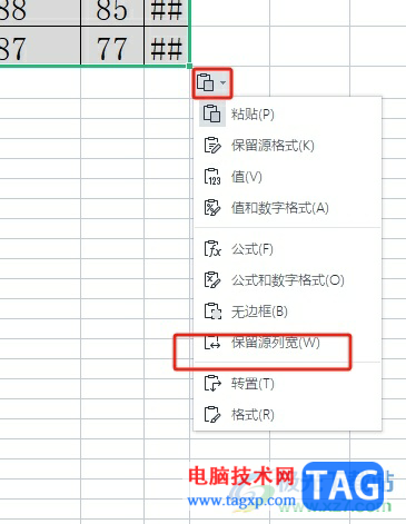 4.成功粘贴表格后,用户按下其中的粘贴图标,弹出下拉选项卡后,用户选择保留源列宽选项