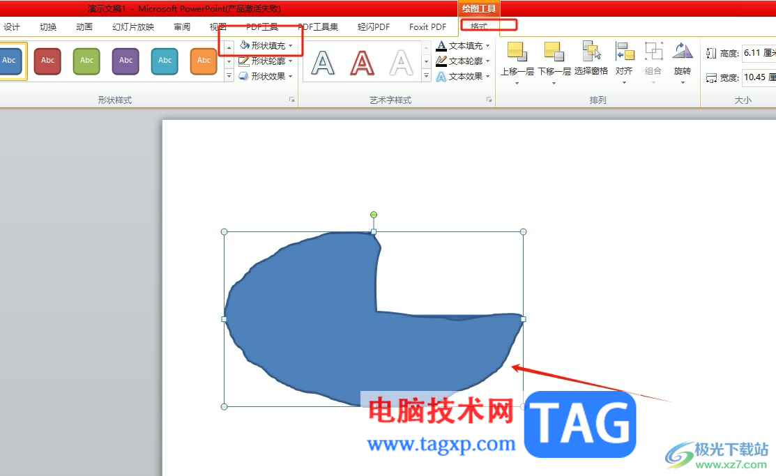 4.用户在不规则图形上完成描边后,会看到描边变成了一个形状,用户需要将其中的填充色去除,可以点击绘图工具的格式选项,在弹出来的选项卡中选择形状填充选项