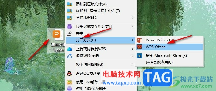 1、第一步,我们在电脑中右键单击一个演示文稿,然后在菜单列表中点击“打开方式”选项,再在子菜单列表中选择“WPS office”选项