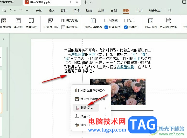 2、第二步,进入WPS对演示文稿的编辑页面之后,我们在该页面中选中一个需要删除的参考线,然后右键单击选择“删除”选项,就可以删除该条参考线了