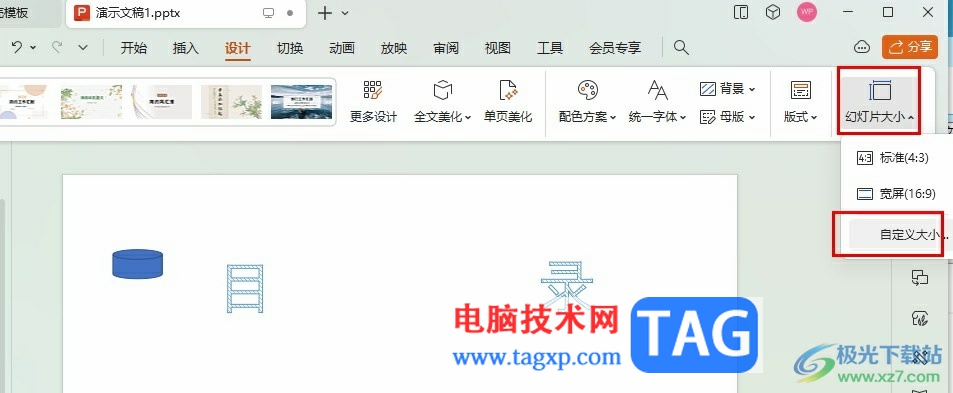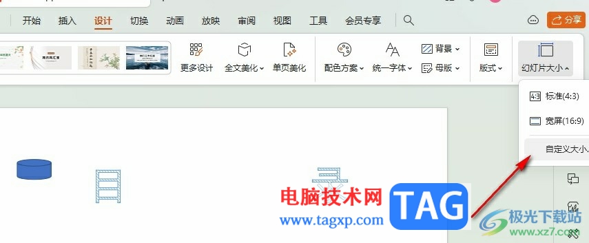 4、第四步,打开幻灯片大小工具之后,我们在下拉列表中点击打开“自定义大小”选项