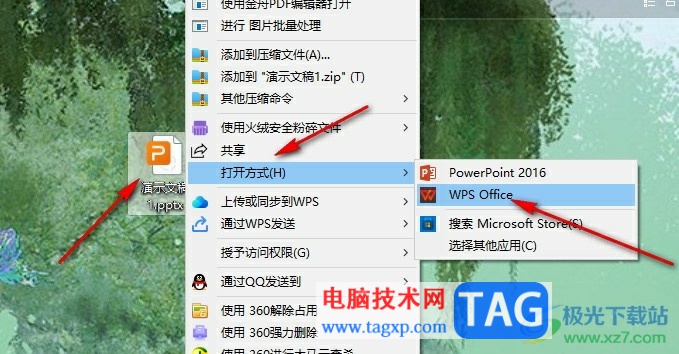 1、第一步,我们右键单击一个需要编辑的演示文稿,然后在菜单列表中点击打开方式选项,接着选择WPS office选项