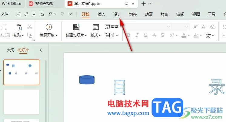 2、第二步,进入WPS页面之后,我们在页面上方的工具栏中打开设计工具