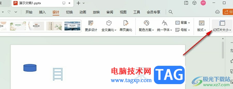 3、第三步,打开设计工具之后,我们在子工具栏中点击打开“幻灯片大小”工具