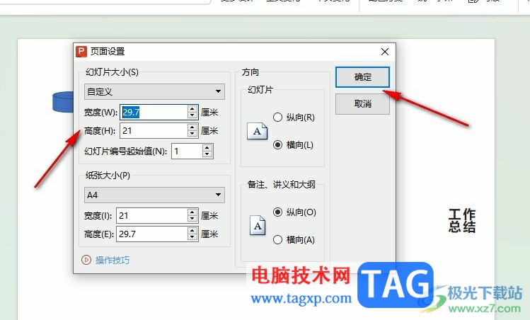 5、第五步,最后在页面设置的弹框中我们输入自己需要的幻灯片宽度以及高度,再点击确定选项即可