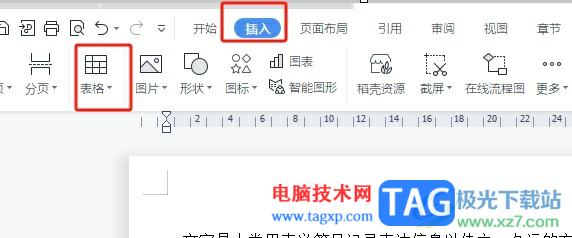 2.在页面上方的菜单栏中点击插入选项,将会显示出相关的选项卡,用户选择其中的表格选项