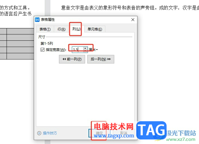 6.接着在列选项卡中,同样将指定宽度的数值设置与行高一致的大小,随后按下底部的确定按钮即可
