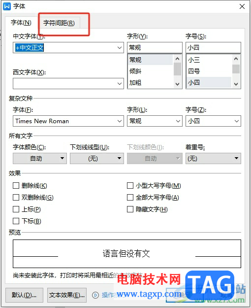 3.进入到字体窗口中,用户将选项卡切换到字符间距选项卡上