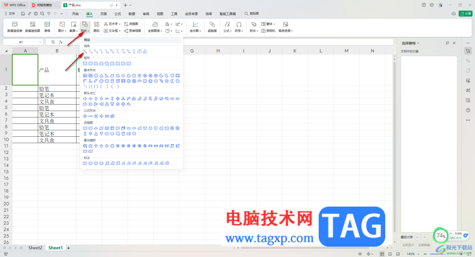 2.之后将鼠标定位到需要插入斜线表头的单元格中,然后点击【形状】的下拉按钮,点击直线形状。