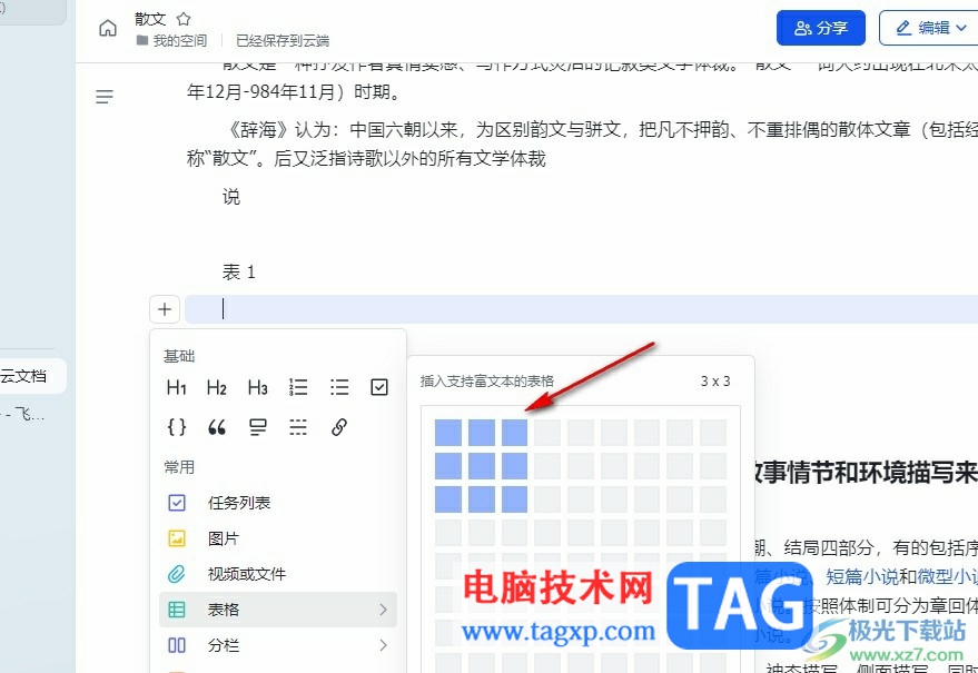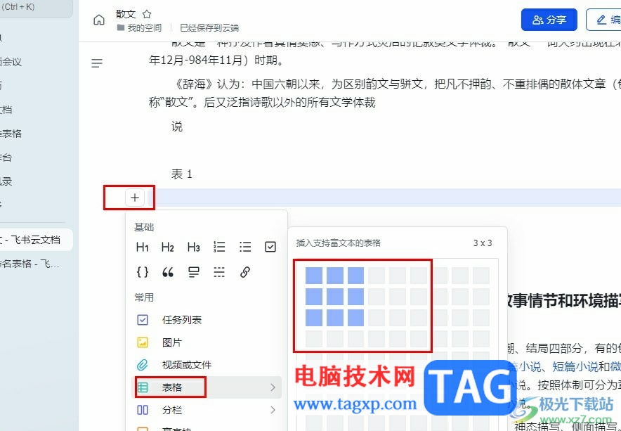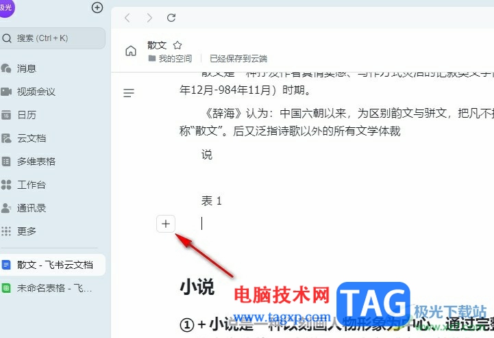 很多小伙伴之所以喜欢使用飞书这款软件,就是因为飞书中的功能十分的丰富,不仅能够支持我们进行日常的考勤打卡,还能对接收到的文档直接进行编辑,或是创建自己需要的在线文档。有的小伙伴在使用飞书对在线文字文档进行编辑的过程中经常会遇到需要的文档中插入表格的情况,这时我们只需要点击打开空白行左侧的“+”图标,然后在下拉列表中找到“表格”工具,打开该工具就能选择表格的行数与列数了。有的小伙伴可能不清楚具体的操作方法,接下来小编就来和大家分享一下飞书在文档中插入表格的方法。