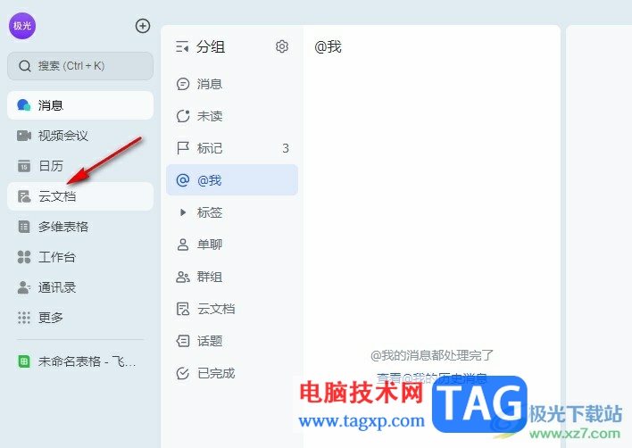 1、第一步,我们在电脑中点击打开飞书软件,然后在飞书页面中点击打开云文档选项