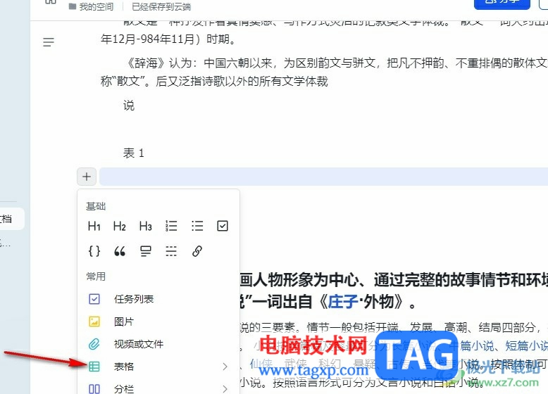 4、第四步,打开“+”图标之后,我们在下拉列表中找到“表格”工具,点击打开该工具