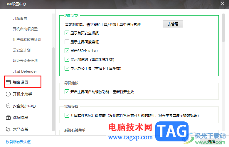 3.这时,即可进入到360设置中心中,在左侧的导航栏中找到【弹窗设置】选项卡,将其点击一下。