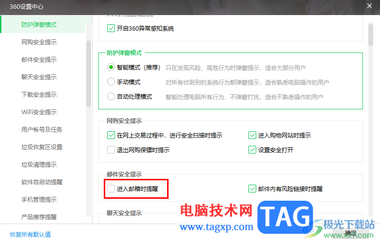 4.随后,用鼠标滚动右侧的页面,就可以找到【邮件安全提示】选项,如果【进入邮箱时提醒】选项没有勾选上。