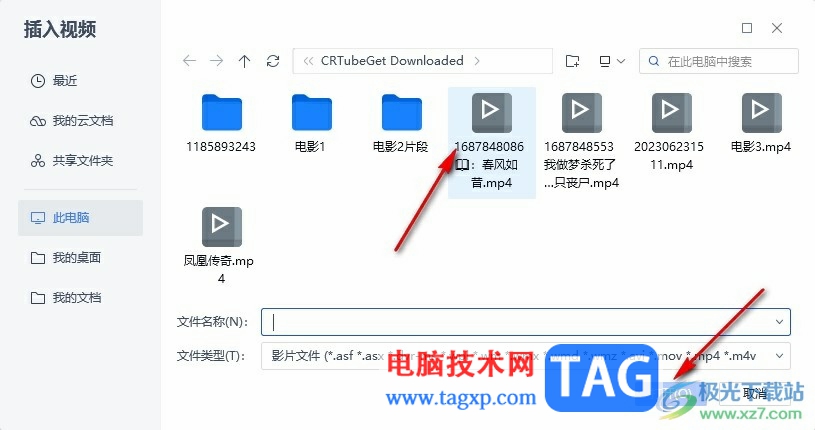 4、第四步,进入文件夹页面之后,我们选中准备好的视频文件,然后点击“打开”选项