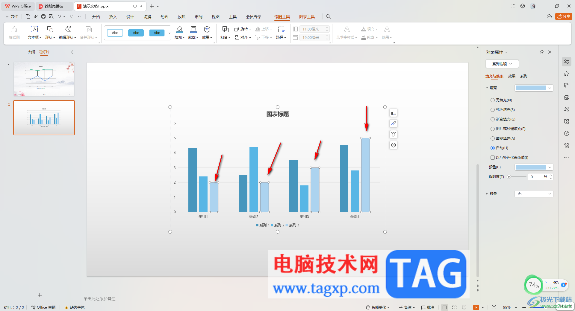 大家在通过wps进行PPT文件的编辑过程中,会需要进行图表的插入,将自己想要分析的数据通过柱形图或者是条形图等体现出来,而有的小伙伴发现通过WPS PPT编辑的图表样式的颜色是比较简约的,如果自己想要将其中重要的系列数据用颜色标记出来,那么怎么操作呢,这种情况的话,就可以通过设置该系列数据的形状填充,选择自己喜欢的颜色为该系列进行填充就好了,非常的方便,下方是关于如何使用WPS PPT重点突出重要数据的具体操作方法,如果你需要的情况下可以看看方法教程,希望对大家有所帮助。