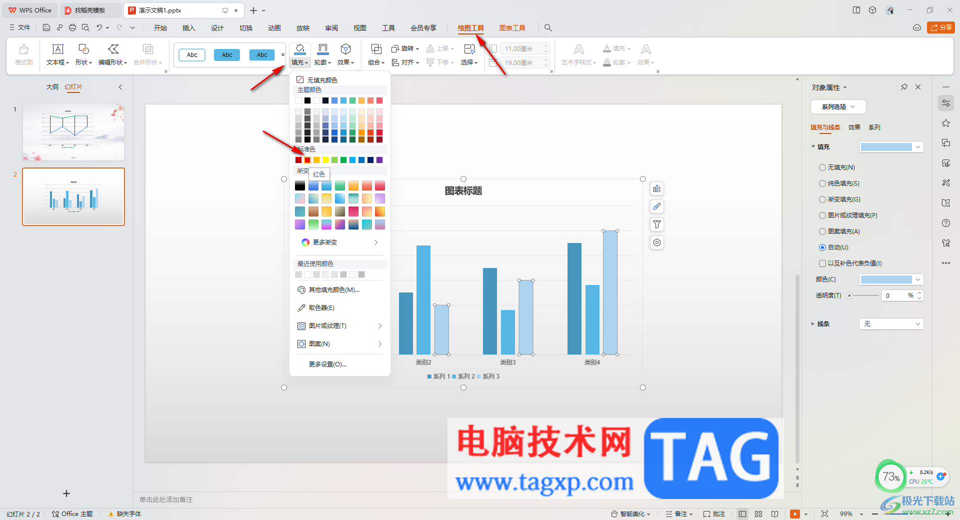 4.接着,再点击页面顶部的【绘图工具】-【填充】,之后在打开的下拉选项中就可以选择自己喜欢的颜色进行点击。