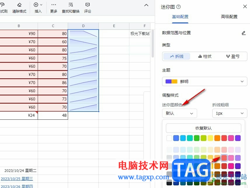4、第四步,打开迷你图编辑窗格之后,我们打开迷你图颜色选项,然后在下拉列表中点击选择一个自己喜欢的颜色