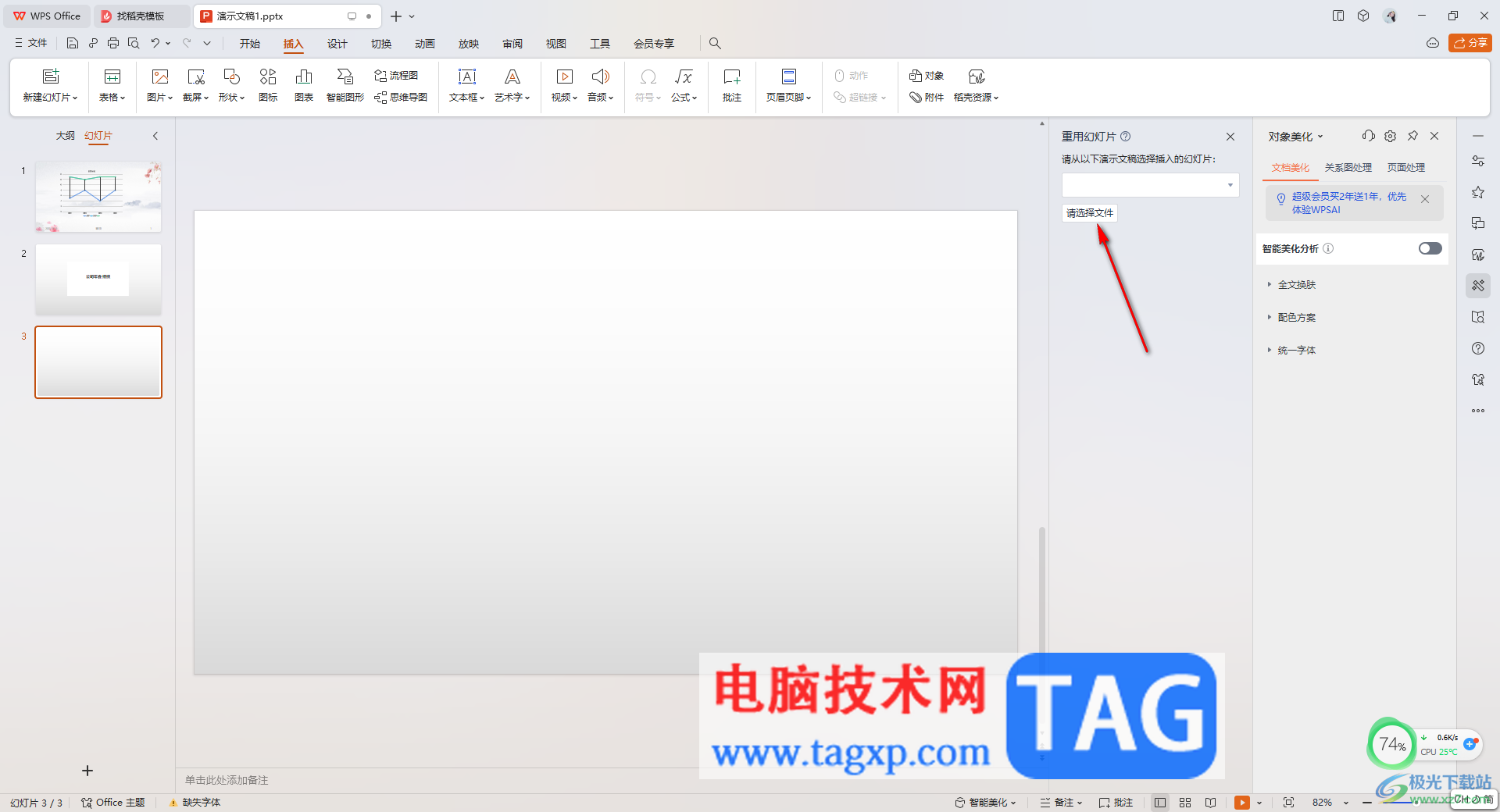 2.之后,点击页面顶部的【插入】选项,之后在工具栏的左侧点击【新建幻灯片】选项的下拉按钮,在打开的窗口中点击【重用幻灯片】。