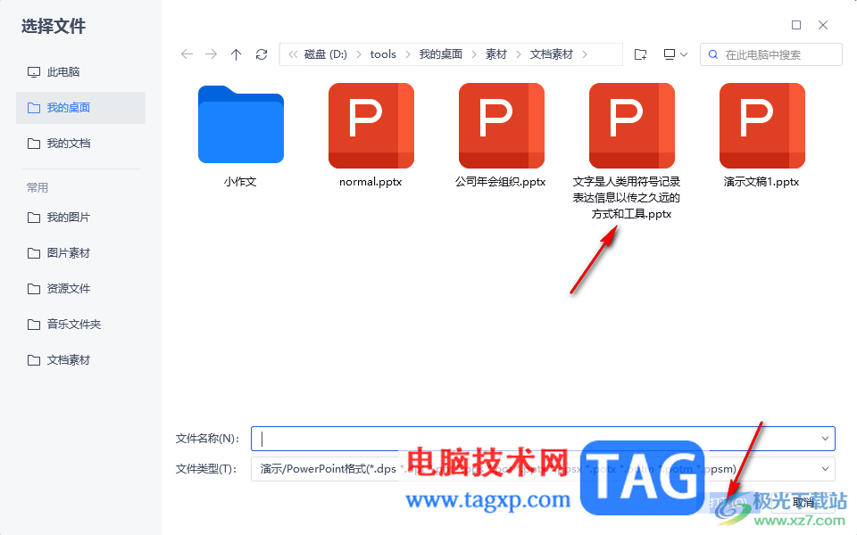 4.之后即可打开一个本地文件夹窗口,在该文件夹中将需要插入的PPT选中打开。