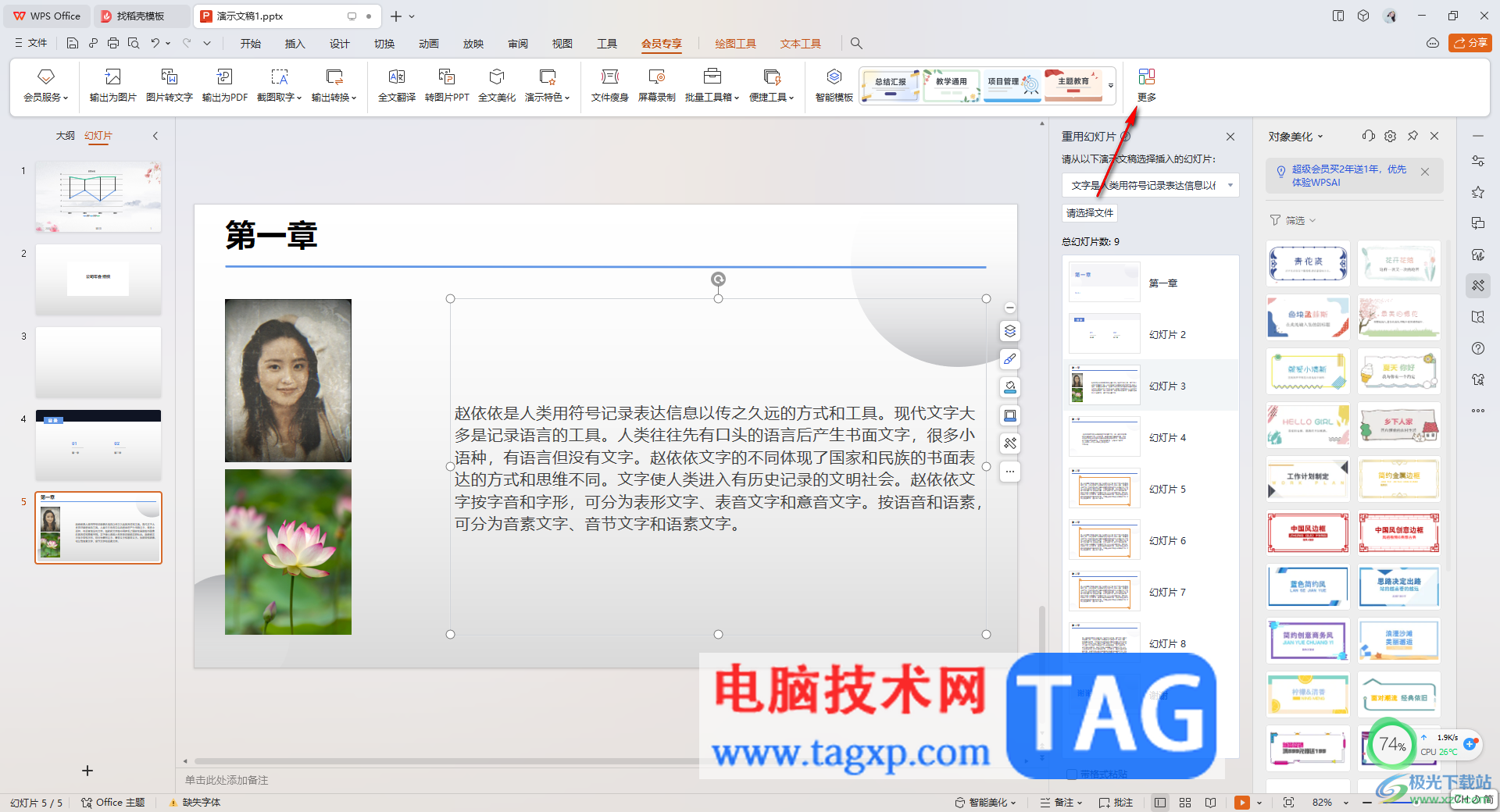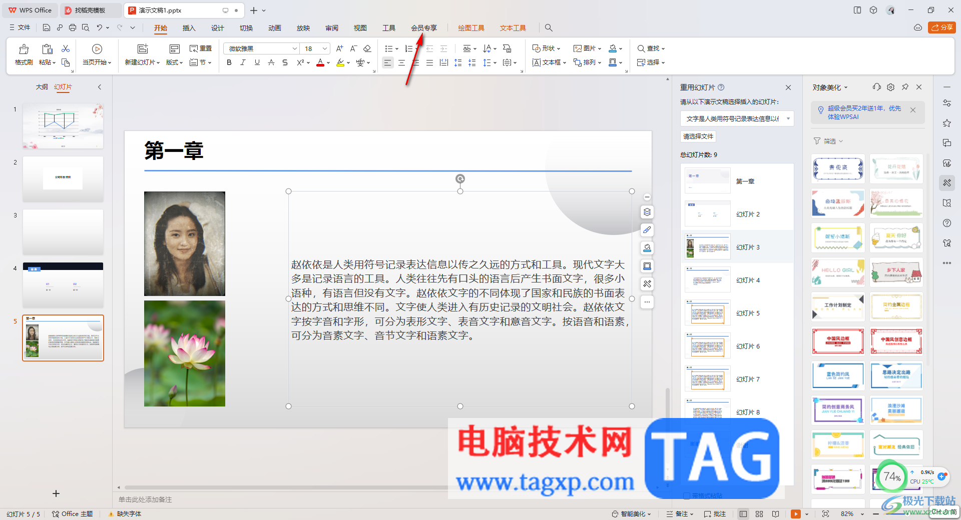 1.打开需要进行设置的PPT演示文稿,之后点击菜单栏中的【会员专享】选项。