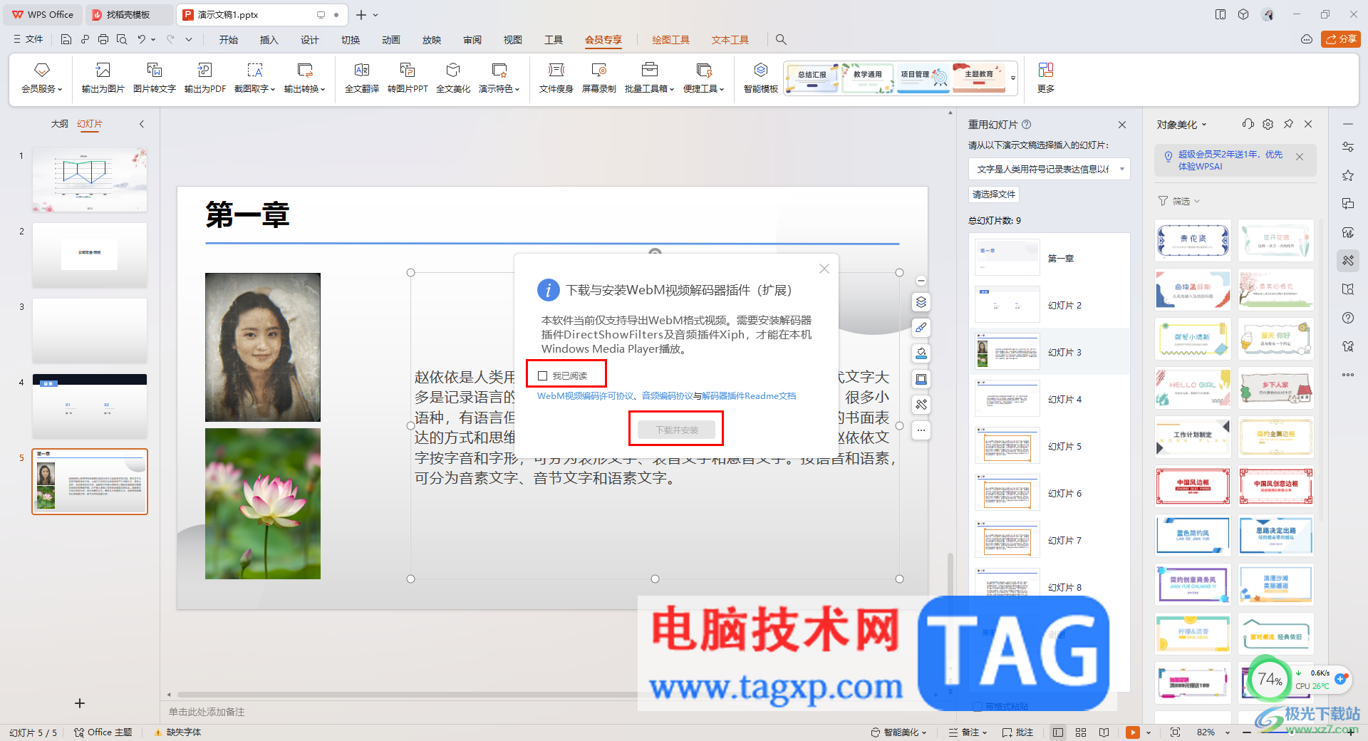 5.随后会返回到编辑页面中,弹出一个需要安装与webm视频解码器插件扩展的提示,将【我已阅读】勾选上,再点击【下载并安装】按钮即可。