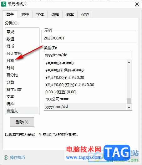 3、第三步,进入设置单元格格式页面之后,我们在数字的列表中点击打开“日期”选项
