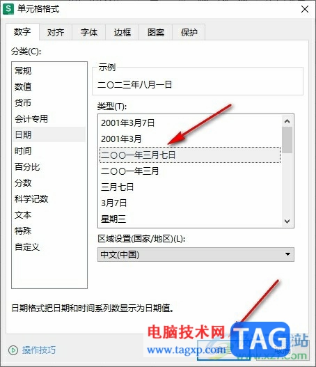 4、第四步,进入日期页面之后,我们在该页面中选择好自己所需要的日期格式,然后点击确定选项即可